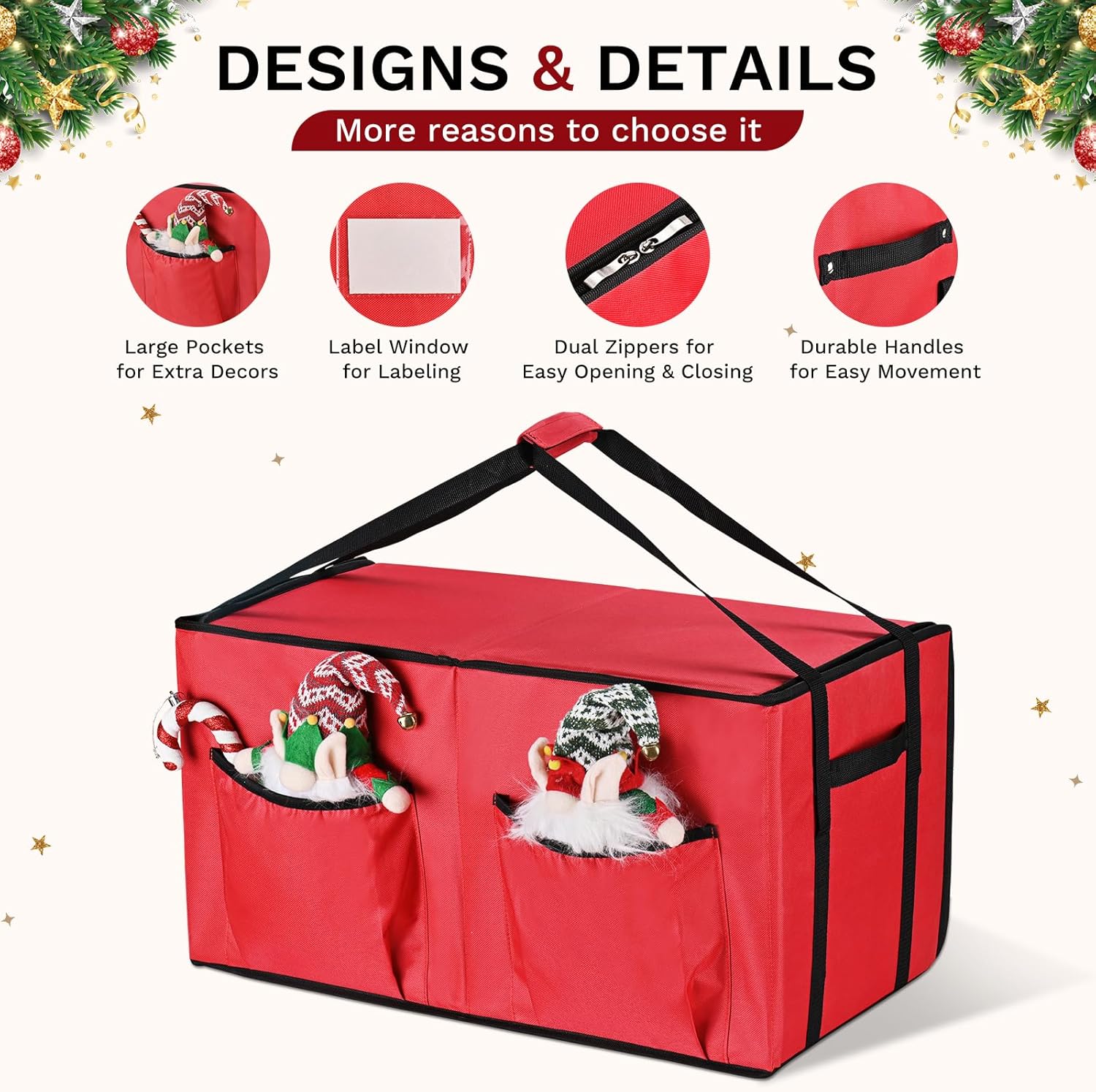 - 【Easy to Carry】- There are 2 extra-large pockets outside the box. You can use them to store extra decors. On both sides of the box have extended carry straps and durable handles. These features make it easy to carry this big box. Whether you're taking it to the storage room or moving it to another place, you won't have a hard time.